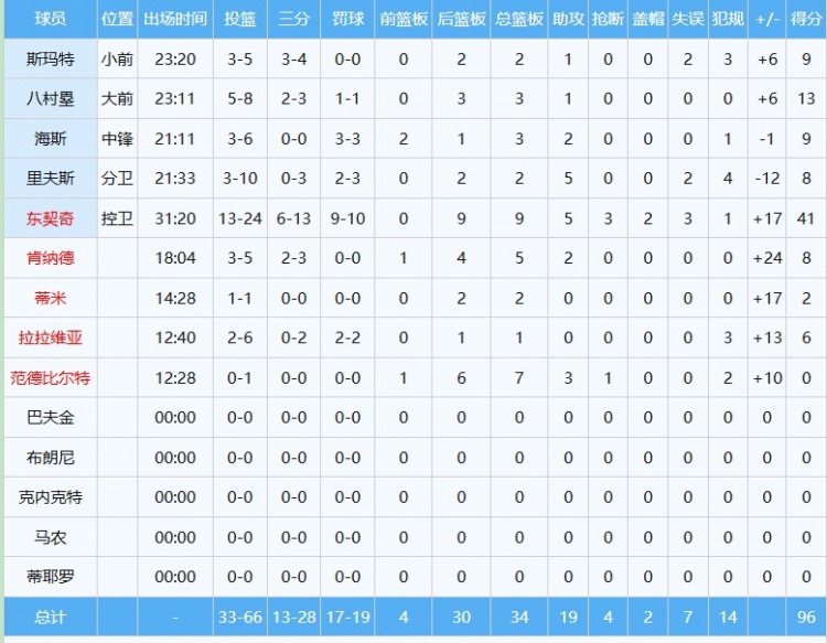 截止到发稿前,东契奇三节出分秒,投中,三分中,罚𰷋,得篮助抢封盖,正负值+17。